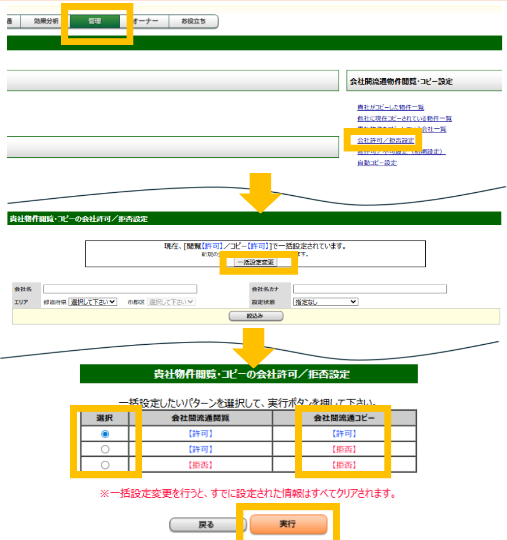 A. SUUMO入稿・分析システムの『管理』画面の「会社間流通物件閲覧・コピー設定」カテゴリ内の「会社許可/拒否設定」ボタンを押下し遷移後の画面上部 「一括設定変更」 ボタンを押下し、【会社間流通コピー】が【拒否】設定になっていないかご確認下さい。