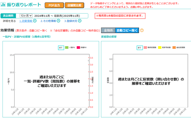期間別で閲覧・反響を振り返りされる場合は、「掲載物件レポート(週次または月次)」がおすすめです。
