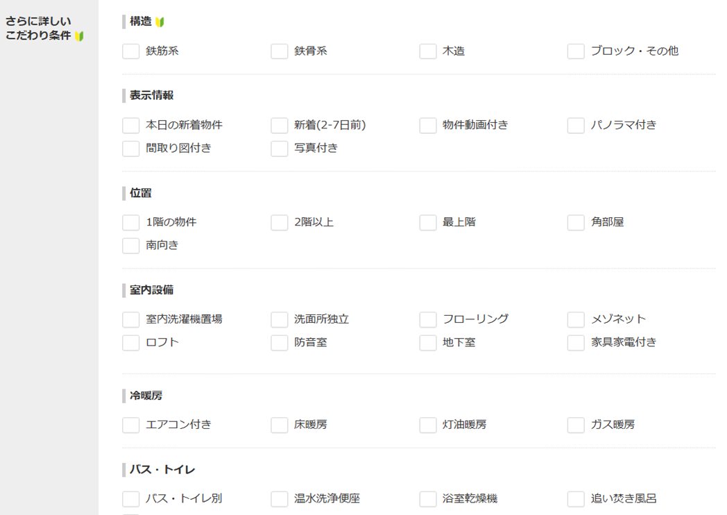 自分が住まうお部屋の基礎情報に加え、こういう家に住みたい・設備が欲しいなどそれぞれの希望条件を絞り込み検索します。