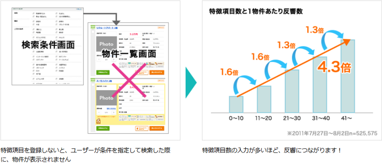 そのため、物件棟情報が正しく掲載されているだけでなく、物件の特徴登録項目が多いほどカスタマーに見ていただける機会が増えます。