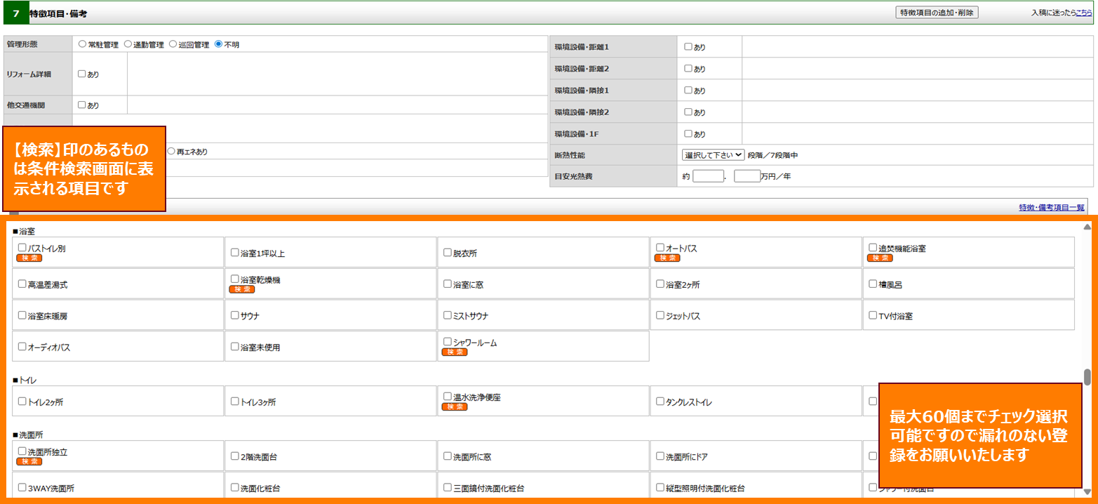 【2】「7:特徴項目・備考」より物件特徴を最大60個まで登録いただけます