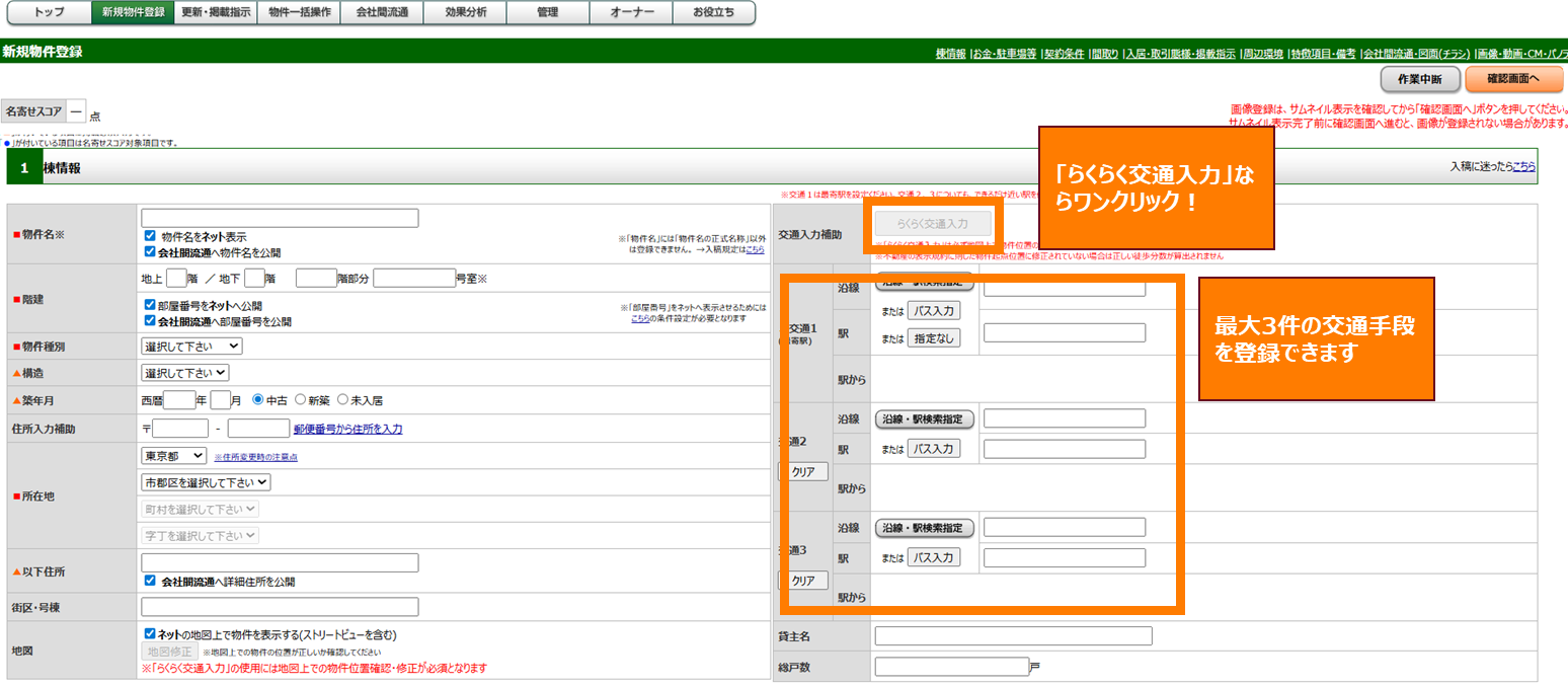 【2】「1:棟情報」の交通項目へ3駅分の情報登録を行っていただけます