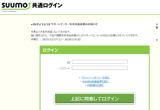 問い合わせ先:SUUMO共通ログインサポートセンター【0120-122-671】