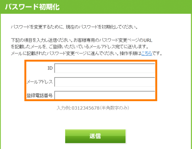 パスワード初期化画面が表示されますので、ID・メールアドレス・登録電話番号を入力して「送信」をクリックしてください。