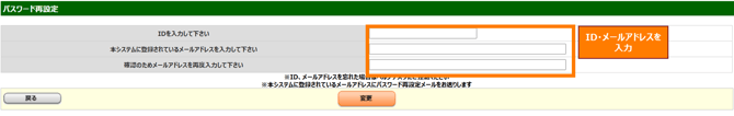 パスワード再設定画面が表示されますので、IDとあらかじめ設定しているメールアドレスを入力して「変更」をクリックしてください。