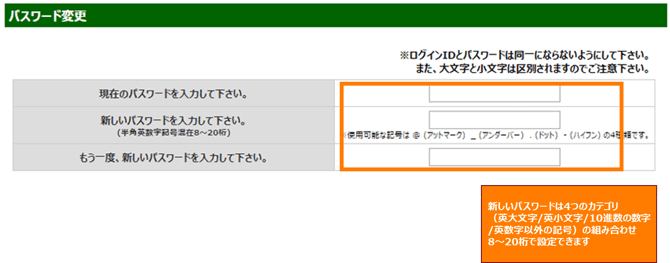 【3】ログイン画面で、ユーザーIDと変更したパスワード(もしくは新しいパスワード)を入力し、「ログイン」ボタンをクリックしてください