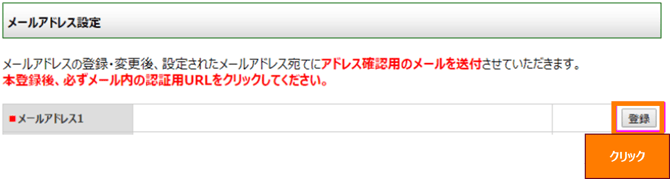 メールアドレスの設定画面が表示される場合は、「メールアドレス1」の登録をクリックしてください。